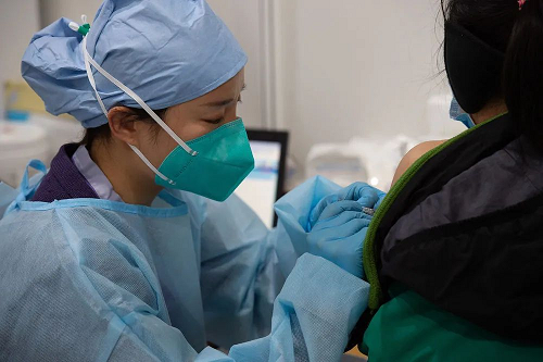 2021年1月2日,在北京市朝陽區壹臨時接種點,醫護人員為接種人員註射新冠病毒疫苗。