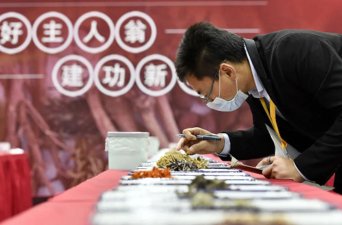 2020年10月15日,全國中藥傳統名堂職業技能競賽決賽在天津舉行,來自全國中藥材鑒別領域37家傳統名堂的75名選手參加。這是選手在參加中藥材識別和真偽鑒別考試。