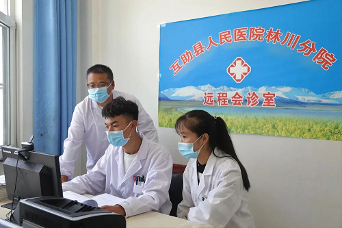 在青海省海東市互助土族自治縣林川衛生院遠程會診室,醫生盛生凱(左二)和同事在連線互助土族自治縣人民醫院專家(2020年9月10日攝)。