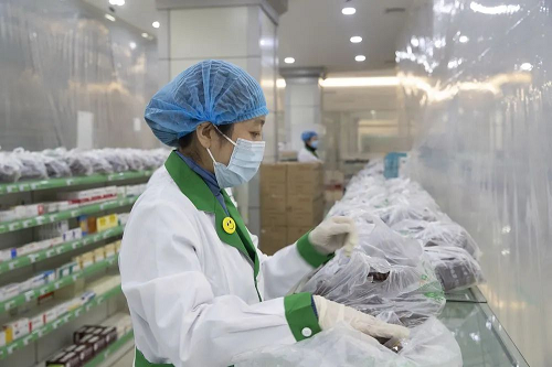 2021年1月25日,在黑龍江省綏化市泰華大藥房內,工作人員打包中藥湯劑。為應對新冠肺炎疫情,綏化市指定醫藥企業代煎中藥湯劑送往市內各個集中隔離點。