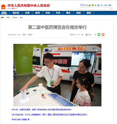 6月19日,中華人民共和國中央人民政府網站報道《第二屆中醫藥博覽會在南京舉行》,文中介紹了四川新綠色藥業科技發展有限公司(簡稱新綠色藥業)戰略合作夥伴成都宇亨智能自主研發的中藥配方顆粒智能調劑系統與“流動應急智能中藥房”。