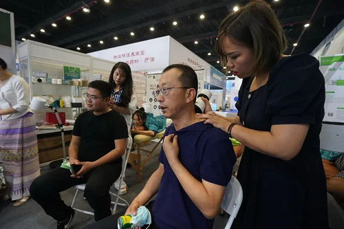 6月19日,在博覽會展館,參觀者在體驗壹款刮灸儀。